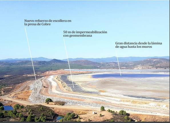 Así Atalaya Mining está obligada por la autorización a utilizar en el recrecido de los muros (escollera) material de los tajos de la propia explotación. Para evitar debilidades estructurales se marca en la autorización el tipo de materiales a usar. Los condicionantes impuestos incluyen asimismo el control de la nivelación de los rasantes y la compactación de la zona.