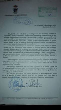Con fecha 31 de agosto del presente año envió usted al correo de la Secretaria de este ayuntamiento, una petición de información sobre un camino de esta localidad conocido como Navalacuba (con anterioridad a esa fecha estuvo reunido usted con este alcalde en este ayuntamiento tratando ese mismo asunto. Posteriormente, con fecha 13 de septiembre, volvió usted a reiterar esa petición en otro correo, en el que, además, insistía en que la respuesta es de vital importancia para el interés público y para no tener que realizarla a través de otros medios .."