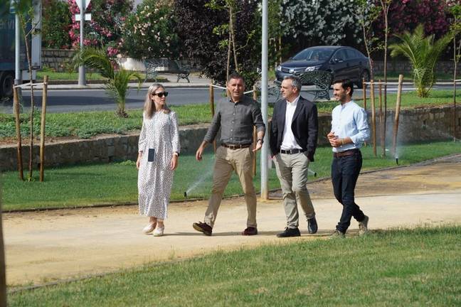 Fruto del convenio de colaboración entre el Ayuntamiento de Moguer y la Fundación Cepsa se ha ejecutado un ambicioso proyecto de adecuación y puesta en valor de un área verde de esparcimiento de unos 10.500 m2 que han visitado hoy Rojas y Cuéllar acompañados de los concejales de Urbanismo, Teresa Díaz, y de Medio Ambiente, Enrique Soriano.