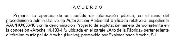 El expediente está promovido por la empresa Explotaciones Aroche en el seno del proceso de Autorización Ambiental Unificada (AAU) para su plan de explotación. El periodo informativo público se cerrará a finales de este mes de junio.