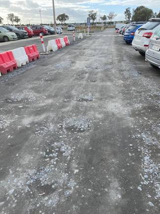 Dejar el coche estos días en el parking onubense Villa de Madrid no resulta tarea fácil. Los baches y desniveles dificultan, no solo la tarea de aparcamiento, sino simplemente el acceso peatonal a la zona.