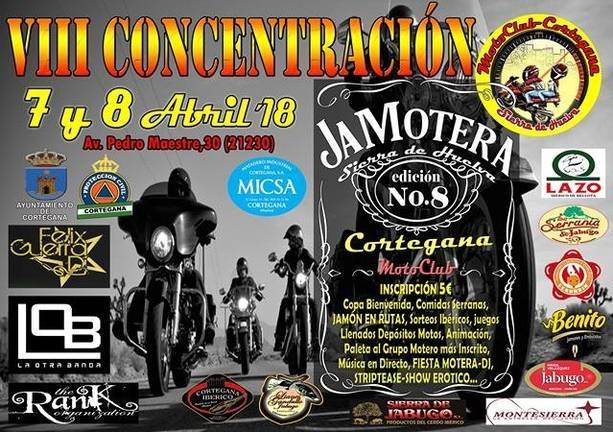 La cita de la VIII Concentración Jamotera de Cortegana se desarrollará los días 7 y 8 de abril. Los moteros serranos esperan a sus amigos llegados desde diversos puntos geográficos en su sede de la Avenida Pedro Maestre número 30 de la localidad corteganesa. En esta edición habrá una mini Peque-Concentración Jamonera dirigida a los más pequeños aficionados, con reparto de chucherías para los participantes.