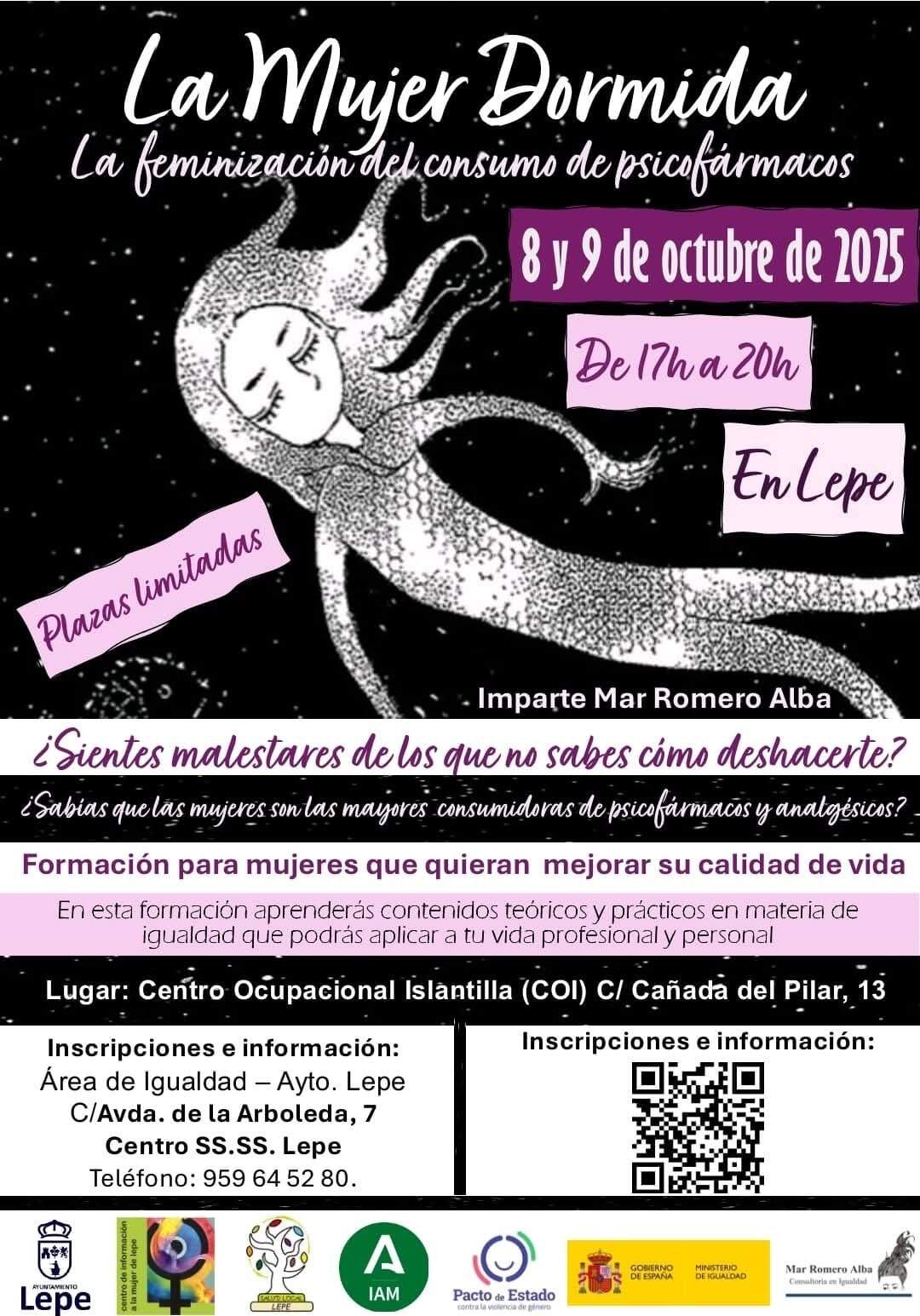 El Centro de Información a la Mujer de Lepe organiza esta semana la formación “La mujer dormida”, una propuesta centrada en analizar la feminización del consumo de psicofármacos y su relación con el bienestar emocional y social de las mujeres. La actividad se desarrollará los días 8 y 9 de octubre y estará impartida por Mar Romero, educadora social y especialista en género.