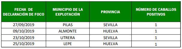 Ya son cuatro los focos de ‘fiebre del Nilo’ detectados en équidos de Huelva y Sevilla en poco más de un mes. Si el pasado 27 de septiembre la Consejería de Agricultura, Ganadería y Pesca confirmó un caso en Pilas y el 9 de octubre hizo lo mismo en otro caballo en Almonte ahora se ha cursado una nueva alerta veterinaria en Utrera y Lepe los días 23 y 25 de octubre respectivamente.