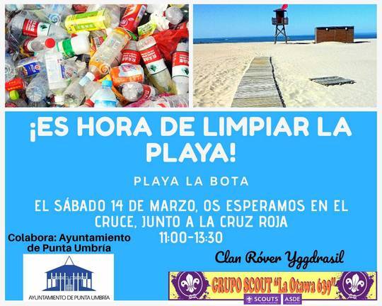 El Ayuntamiento de Punta Umbría colabora este sábado, 14 de marzo, en una jornada de voluntariado para limpiar la playa de La Bota que ha convocado el Grupo Scout 'La Otawa 639' de Huelva, a través de su Clan Yggdrasil.