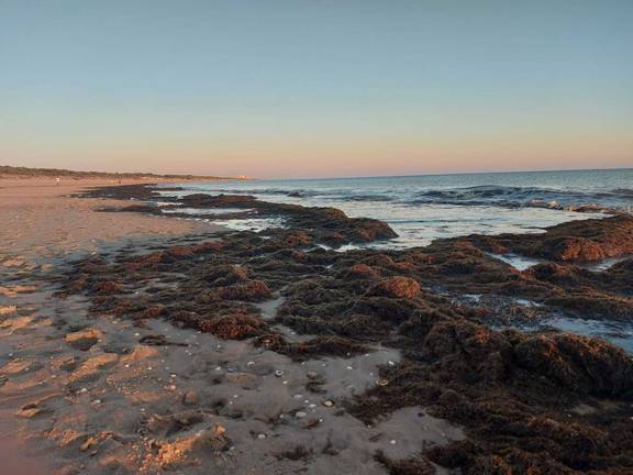 Algunas playas de Huelva, entre ellas las de La Bota y El Cruce, en Punta Umbría, están amaneciendo estos días cubiertas por montañas de algas.