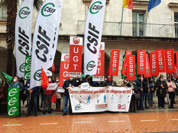 Los sindicatos CSIF, UGT y CC.OO han vuelto a concentrarse este jueves como medida de protesta para reivindicar la implantación de la carrera profesional para todas las categorías del Servicio Andaluz de Salud (SAS). Se trata de la séptima jornada de movilizaciones con la que se pretende que 60.000 profesionales del SAS que actualmente no tienen acceso a la carrera profesional dejen de estar "discriminados". Los afectados suman más de 4.000 en la provincia de Huelva.