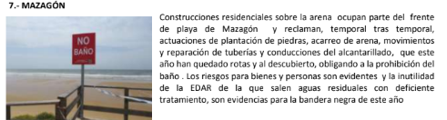EDAR de Mazagón. La depuradora de Mazagón sigue vertiendo fuera de norma, a través de un emisario submarino, cuya estructura se rompió con el último temporal, extendiendo el vertido a toda la zona y obligando a prohibir el baño.
