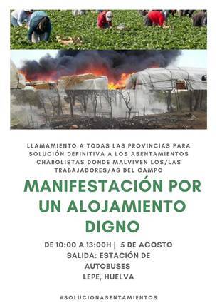 La más que cuestionable gestión de este asunto, según ha informado “Solución Asentamientos”, ha provocado que se convoque una manifestación el día 5 de agosto a las 10:00, con salida de la estación de autobuses de Lepe hasta el Ayuntamiento, bajo el lema de: “POR UN ALOJAMIENTO DIGNO”; como muestra de la repulsa a la inacción de las Administraciones y para indicar claramente que no se aceptan más chantajes, mentiras ni manipulaciones en las informaciones que desde el Ayuntamiento de Lepe se están lanzando para limpiar su imagen, que solo puede ser limpiada con la negociación y la aportación de soluciones reales y urgentes. Es la primera de las movilizaciones que se llevarán a cabo, que de no llegar a algún tipo de solución urgente, se trasladarán también a lugares como Islantilla o La Antilla a fin de contrarrestar las manipulaciones informativas del consistorio que están mostrando una ficción alejada a la realidad.
