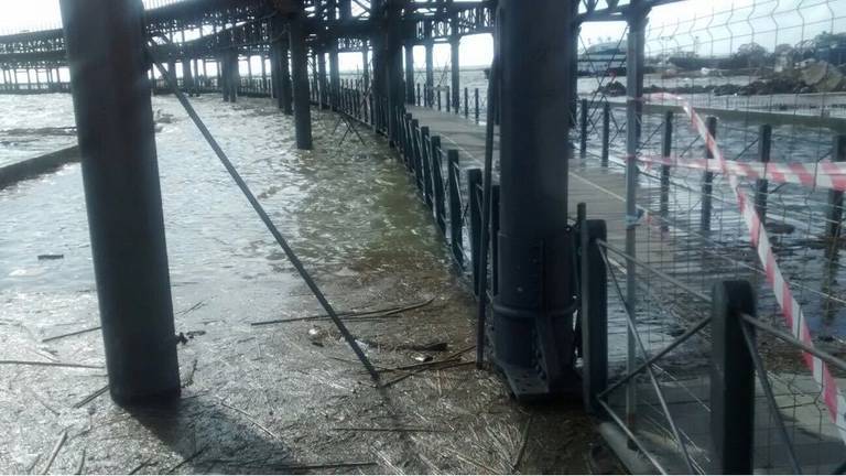 Tambien en Huelva capital, la subida mareal ha alcanzado el Muelle del Tinto que ha sido precitado para garantizar la seguridad en la zona.