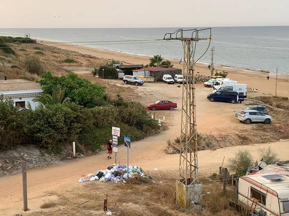 Acampadas masivas y vertidos de basuras asedian la playa de Mazagón, junto al Parador