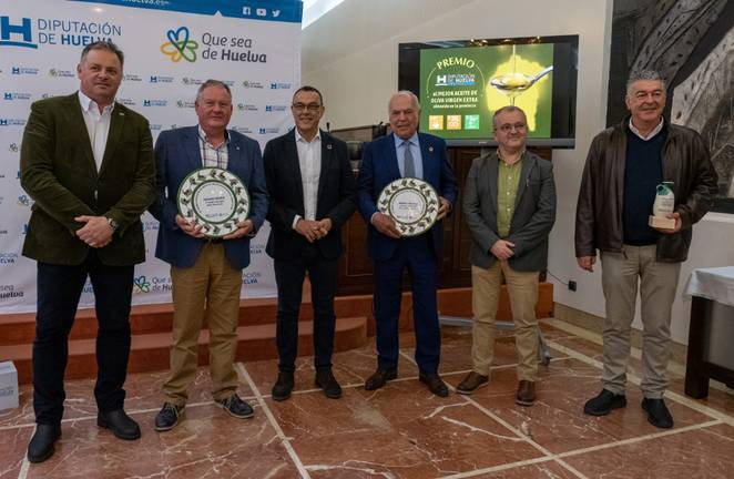 La Diputación de Huelva ha entregado este martes los galardones correspondientes a la séptima edición del premio que entrega la institución al Mejor Aceite de Oliva Virgen Extra de la Provincia en la cosecha 2019/2020, convocado anualmente a través del Servicio de Investigación Agrícola y Ganadera de la institución provincial, y que este año se ha entregado a la Cooperativa Olivarera San Bartolomé SCA de Paterna del Campo en la categoría de gran producción.