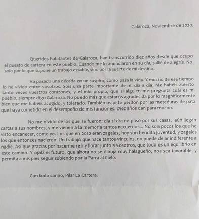 Aprovecha Pilar para pedir perdón por esos fallos que se pueden cometer en cualquier trabajo, y no se olvida de los que se fueron. “Día sí, día no, paso por sus casas, aún llegan cartas a sus nombres, y me vienen a la memoria tantos recuerdos…”. La cartera es un referente para comprobar el paso del tiempo en el pueblo, ya que, como bien indica, “no son pocos los que he visto encanecer, como yo. Los que en 2010 eran zagales, hoy son bendita juventud, y zagales los que entonces nacieron”.