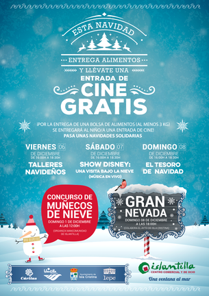 El Presidente del Centro Comercial Islantilla, Eduardo Díaz, ha recordado además “la campaña solidaria puesta en marcha un año más con motivo de estas Fiestas, y que consiste en el regalo de una entrada de cine a cada niño o niña que entregue una bolsa de hasta 3 kilos de alimento a modo de donación”. Las entradas serán válidas para cualquiera de las sesiones ofrecidas por Cines La Dehesa Islantilla durante este mes de diciembre.