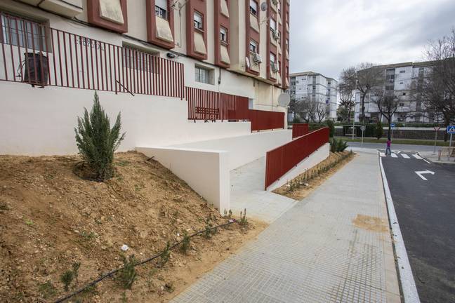 Para ello, se han habilitado dos rampas, una paralela al nuevo vial, que permite el acceso a los portales hasta ahora vetados para personas con movilidad reducida; y otra al Este de la urbanización, en la intersección del Pasaje el Greco con la Avenida Santa Marta, donde hasta ahora existía una rampa para peatones, pero con una pendiente longitudinal muy acusada.