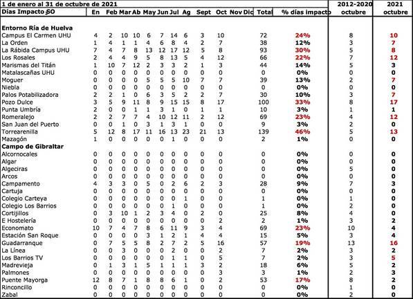 El pasado mes de octubre se han anotado hasta 10 días de impacto por dióxido de azufre en el Campus del Carmen-Universidad; 12 jornadas en la barriada de Los Rosales. Ha sido de los peores octubre que se recuerdan desde 2012 tal y como se puede observar en la tabla publicada por el Servicio de Calidad del Aire de la Universidad de Huelva-CSIC.