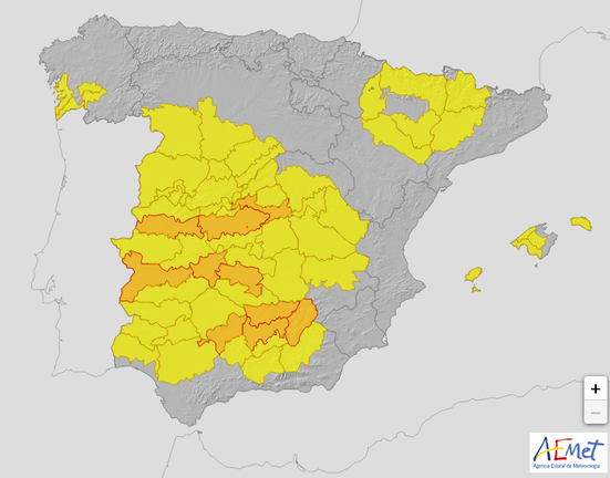 Las comarcas del Andévalo y Condado onubenses, así como Aracena, estarán en aviso amarillo desde las 12 del mediodía de este miércoles hasta las 19.59 horas, tal y como indica Aemet; alcanzándose los 39 grados en los termómetros. Aunque la humedad presente puede hacer que la sensación ambiente supere claramente la temperatura estimada.