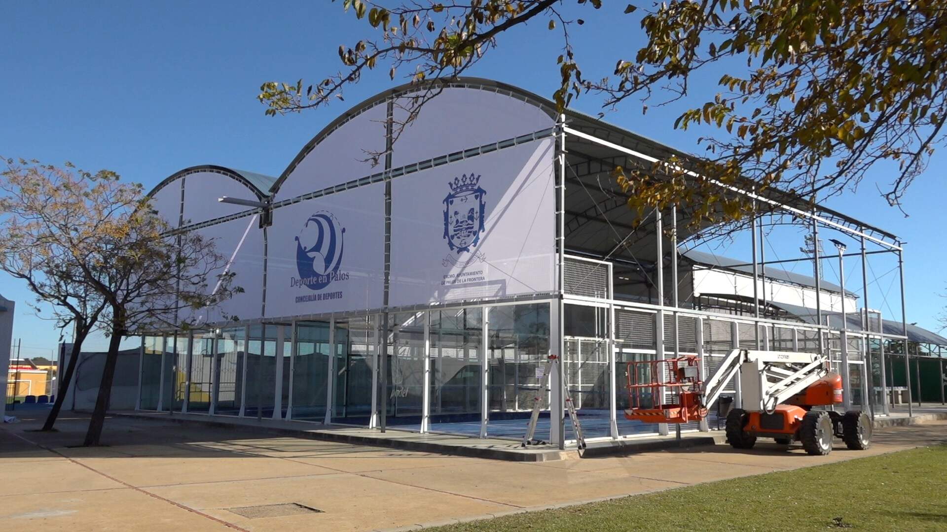 El Ayuntamiento de Palos de la Frontera ha completado recientemente la instalación de lonas técnicas serigrafiadas y un sistema de canalones para la recogida de aguas en las pistas municipales de pádel, con el objetivo de proteger tanto las instalaciones como a los jugadores frente a las inclemencias meteorológicas.