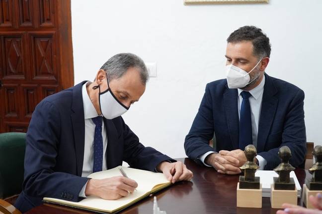 Durante su visita al ayuntamiento moguereño tanto Duque como Salom firmaron en el libro de honor de visitas de la institución municipal, y recibieron como recuerdo de su estancia en Moguer un busto del Nobel Juan Ramón Jiménez y una selección de frutos rojos de la tierra.