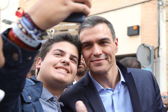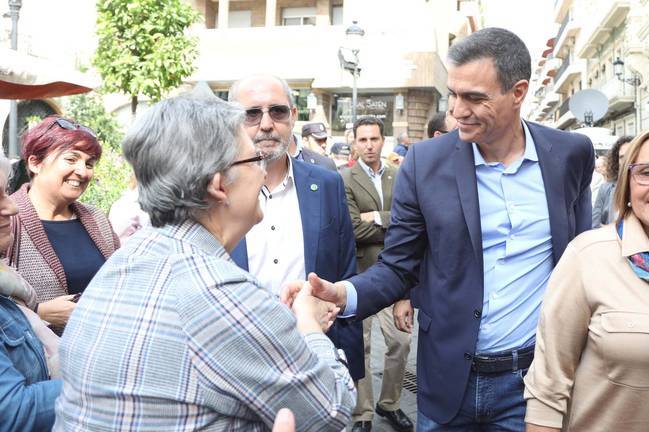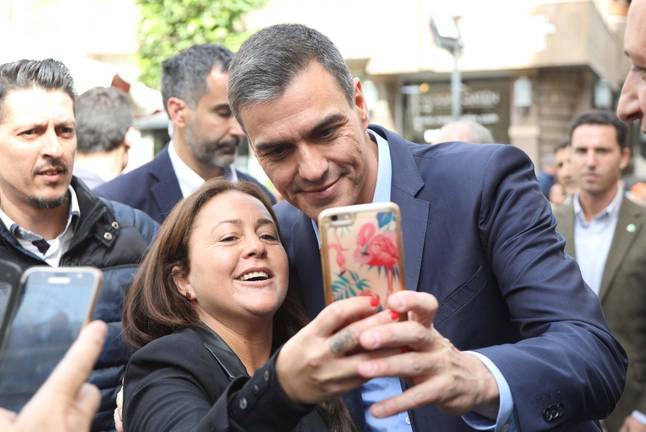 En los aledaños del Gran Teatro, algunos han aprovechado para hacerse fotografías con Pedro Sánchez, que ha atendido, en modo campaña, a numerosos onubenses.