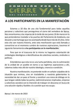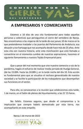 La organización ha pedido a empresarios y comerciantes de Nerva que se sumen a la jornada de protesta realizando media jornada de huelga general, desde las 15.00 horas hasta las doce de la noche del 10 de marzo. Creen que esta acción es fundamental para que se visualice el rechazo generalizado de la sociedad nervense y se facilite la participación de trabajadores y trabajadoras del sector.