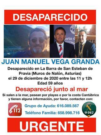 La búsqueda de Juan Manuel Vega Granda sigue. Hay muy mal tiempo en la zona. Más de 200 voluntarios se han sumado hasta ahora a las complicadas labores de búsqueda en las que han participado equipos especializados de la Guardia Civil de Seguridad Ciudadana, la Unidad Canina y guías, Policía Judicial, la Patrulla Fiscal y de Fronteras (PAFIF), el Grupo de Rescate Especial de Intervención en Montaña (GREIM) de Mieres, buzos, Salvamento Marítimo, Bomberos y Policía Local.