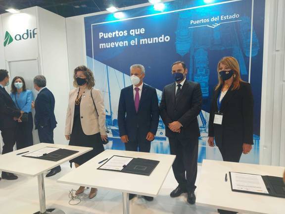 Francisco Toledo y Pilar Miranda, presidentes de Puertos del Estado y de la Autoridad Portuaria de Huelva, respectivamente, y María Luisa Domínguez, Directora General de Planificación Estratégica y Proyectos de Adif, en presencia del Ministro de Transportes, Movilidad y Agenda Urbana, José Luis Ábalos, han firmado la adenda y prórroga al convenio regulador de las aportaciones financieras de la Autoridad Portuaria de Huelva con cargo al Fondo Financiero de Accesibilidad Terrestre Portuaria (FFATP) en relación con su contribución a las actuaciones de mejora en la línea ferroviaria Huelva-Sevilla.