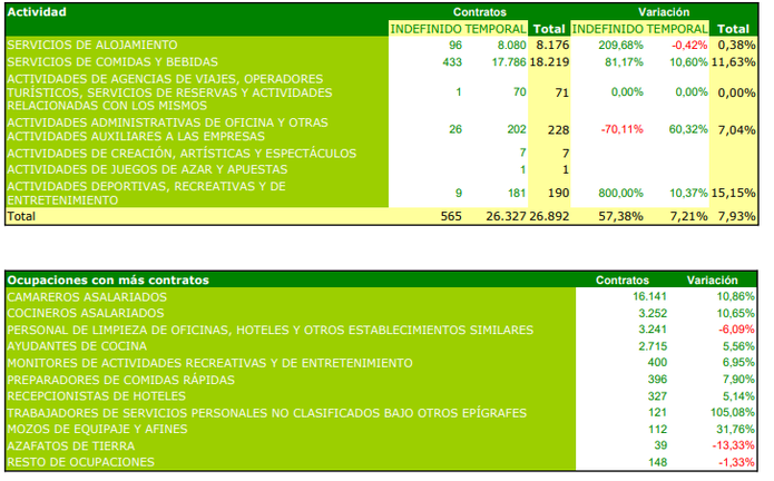 Las profesiones más demandadas han sido las de camareros, con 16.141 contratos, seguidas a mucha distancia de las de cocineros (3.252), personal de limpieza (3.241) y ayudantes de cocina (2.715). Muy por debajo quedan los monitores de entretenimiento, con 400 contratos durante la temporada turística de verano, los preparadores de comida rápida, con 396 empleos, y los recepcionistas de hotel (327).