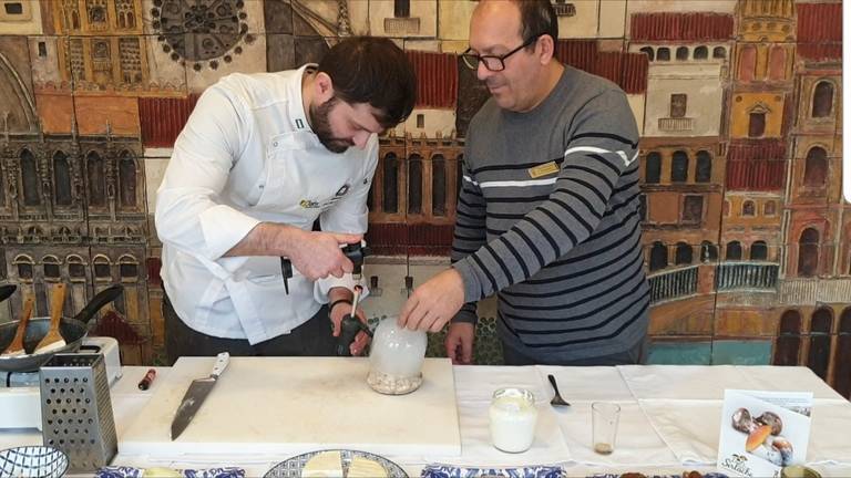 Javier Fuster, el propietario del local, no sólo afrontó las pruebas con seguridad, sino que, fiel a su estilo innovador, ofreció todo un showcooking en directo que sorprendió a Hermoso. ‘El Chef de la Sierra’ elaboró un risotto de boletus incluyendo ingredientes autóctonos de la Sierra y de otra procedencia, como queso puro de cabra, nata fresca, boletus edulis, cebolla y arroz bomba. Finalmente, con unos útiles diseñados para ello, el cocinero incorporó humo de encina dentro del emplatado, para impregnar de aroma al risotto.