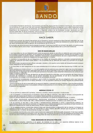 El bando recoge tanto medidas generales, como otras medidas referidas a la movilidad y a la agrupación de personas, y en bares, cafeterías y restaurantes conforme a la normativa anticovid en vigor.
