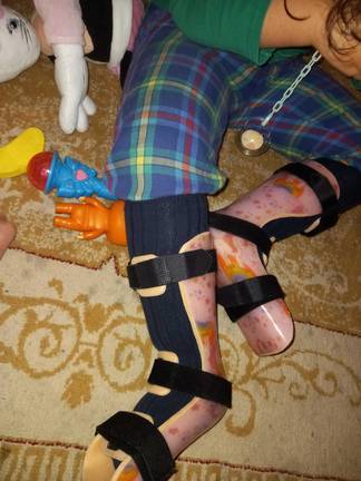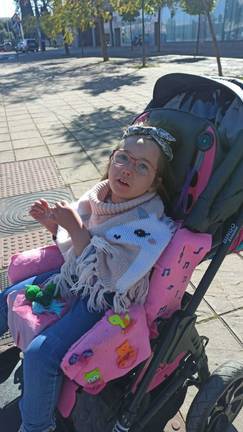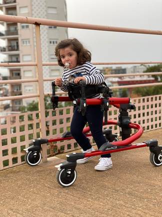 "La sacamos todos los días de paseo y está comenzando a dar sus primeros pasos en su andador que se lo ha recetado la Seguridad Social. También utiliza dafos durante el día y durante la noche para corregir sus pies y que obtenga un paso más firme", ha explicado esta madre.
