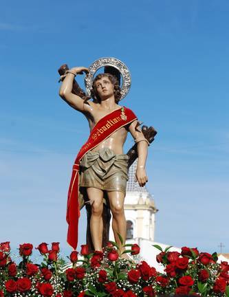 Tras la misa, se produjo la esperada salida en procesión del Patrón desde la Iglesia Parroquial para realizar un recorrido cargado de muestras de cariño y devoción. La comitiva estuvo encabezada por los mayordomos, los miembros de la Junta de Gobierno de la Hermandad de San Sebastián, las hermandades invitadas y las autoridades locales, presididas por el alcalde.