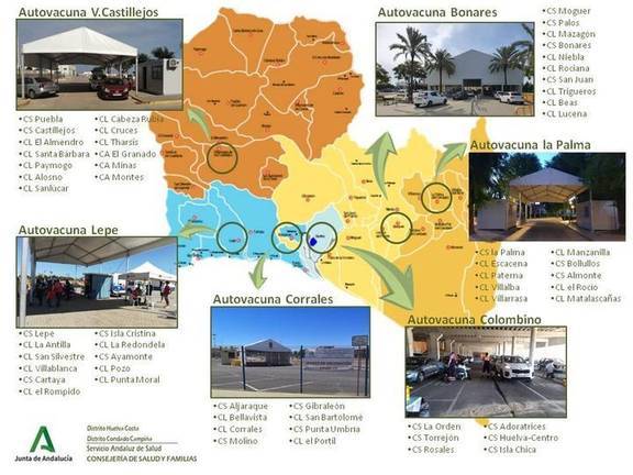 Estos vacunódromos se distribuyen en la provincia de Huelva en Almonte (polideportivo municipal), en Bonares (recinto ferial), en Huelva capital (Estadio Colombino), en La Palma del Condado (frente al centro de salud) y en Lepe (polideportivo municipal). Igualmente, en los centros de salud de Ayamonte, Bonares, Bollullos… existen carpas anexas a los mismos para realizar las vacunaciones y PCR.