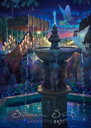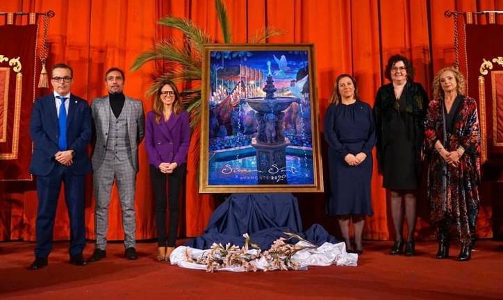 El Teatro Cardenio de Ayamonte ha acogido este sábado la presentación del cartel anunciador de la Semana Santa ayamontina 2020, declarada Fiesta de Interés Turístico Nacional de Andalucía. Un magnífico trabajo en el que Daniel Franco da especial protagonismo a la fuente de la Plaza de la Coronación. Una fuente que es todo un símbolo de esta ciudad y que el actual equipo de gobierno volvió a dotar de vida, y que ahora el pintor ha convertido en un destacado elemento dentro de la estampa que representa el cartel.