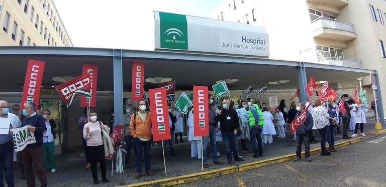 El sindicato CSIF, junto a UGT y CCOO, se ha concentrado esta mañana en la puerta principal del hospital Juan Ramón Jiménez de la capital para protestar contra la Orden de 8 de noviembre por la que se establecen medidas en materia de recursos humanos para la gestión de la de crisis sanitaria en el ámbito del Servicio Andaluz de Salud, y ha anunciado que estudia acciones legales contra la misma.
