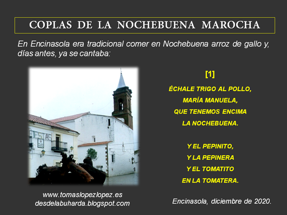 Desde primeros del mes de diciembre, las redes sociales cuentan con una nueva iniciativa para divulgar el folklore onubense. La idea ha partido de Tomás López López, profesor, escritor e investigador de Encinasola, quien está recopilando las Coplas de la Nochebuena Marocha en una serie de artículos que está publicando en su blog.