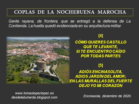 La frontera centra la tercera coplilla, cuyas circunstancias han marcado el patrimonio y la identidad de los marochos. Por ello, no son de extrañar la canción de ‘Cómo quieres castillo que te levante, si te encuentro caído por todas partes’, que fue incluida en un disco del mítico grupo Jarcha; o también ‘Adiós Encinasolita, adiós jardín del amor; en las murallas del Fuerte dejo yo mi corazón’.