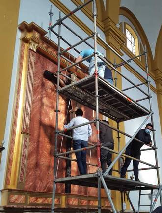 Justo ayer se encontraban realizando la bajada y el traslado del Santísimo Cristo del Perdón, ubicado en la Parroquia, para la restauración que va a llevar a cabo la restauradora Ana Beltrán durante los próximos meses y que permitirá a esta bella imagen de Antonio León Ortega recuperar su esplendor.
