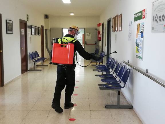 El dispositivo para la prevención y extinción de incendios forestales (Infoca) continúa con sus labores de desinfección contra el coronavirus en espacios públicos que se consideran sensibles, como centros de salud, residencias de mayores, mercados de abastos, estaciones de autobuses, jefaturas de Policía Local y cuarteles de la Guardia Civil.