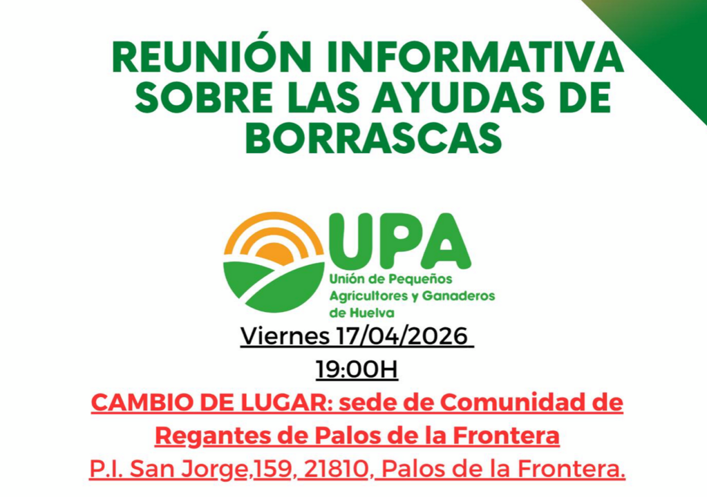 UPA Huelva ha organizado para este miércoles, 17 de abril, una reunión informativa dirigida a los afectados por las borrascas, con el objetivo de explicar las ayudas disponibles y orientar sobre su tramitación.