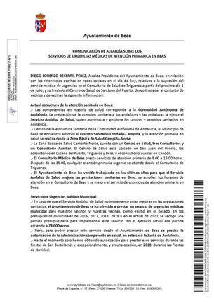 Ante la avalancha de comentarios, el propio Ayuntamiento de Beas ha afirmado que se ha solicitado a la Junta de Andalucía la mejora de los servicios que se ofrecen en el pueblo y que se conceda un permiso para mantener un servicio de urgencias permanente en Beas, donde el propio consistorio se haría cargo de ello a través de una partida presupuestaria precisa.