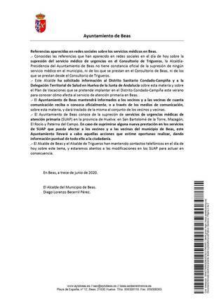 El comunicado municipal llega ante los numerosos rumores que afirman que la atención sanitaria que se prestaba en el consultorio de la localidad vecina de Trigueros se había suspendido. Algo que ha causado preocupación e inquietud en los vecinos de Beas ya que el único centro de salud operativo es el de San Juan del Puerto.