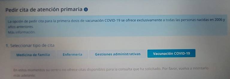 Diariodehuelva.es ha comprobado las opciones de vacunación y efectivamente los mensajes que ofrece el sistema implementado por Salud confirman la dificultad de pillar citas para vacunación de los adolescentes, en contraste con el dinamismo y fluidez que ha demostrado en procesos de vacunación anteriores.