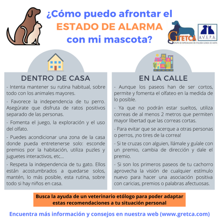 Aunque el Gobierno haya informado que los paseos de los perros no tienen por qué hacerse diferentes, simplemente hay que evitar el contacto social, para minimizar riesgos se recomiendan realizar paseos cortos. Por eso, para compensar la disminución de ejercicio, se debe permitir y fomentar el olfateo durante el mismo en la medida de lo posible y sin que eso se demore en exceso.