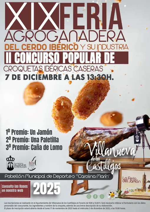Villanueva de los Castillejos se prepara para acoger el II Concurso Popular de Croquetas Ibéricas Caseras, que se celebrará el próximo 7 de diciembre a las 13:30 horas en el Pabellón Municipal de Deportes “Carolina Marín”. La iniciativa forma parte de la XIX Feria Agroganadera del Cerdo Ibérico y su Industria y busca rendir homenaje a los sabores tradicionales de la comarca.