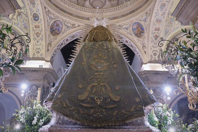 El Pastorcito, que luce el resplandor plateado, a juego con las ráfagas y la corona de Su Madre, estrena un orbe en plata y turquesa, donado por José María Carrasco Sala, quien también ha confeccionado un Rosario para la Virgen. Las flores que lleva son rosas y orquídeas.