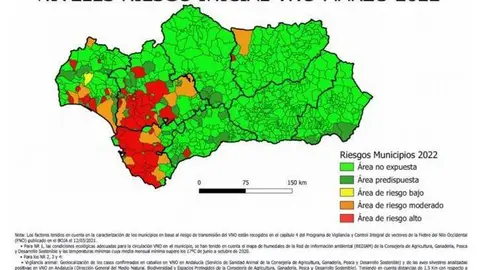 En Huelva se ha detectado presencia del virus este verano en los municipios de Almonte, que linda con la zona de Sevilla más afectada, La Palma del Condado y ahora Campofrío., este último municipio fuera de la tradicional zona de riesgo dibujada y mapeada por la Junta de Andalucía. Y con anterioridad en 2023 en Hinojos, Moguer y Alosno