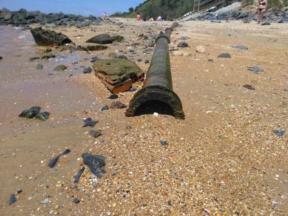 Esta tubería de un antiguo colector y los restos de arquetas que vemos en la foto no han sido descubiertos por las últimas mareas, llevan así mucho tiempo a la vista de todos en una pequeña cala de la playa de Ciparsa, próxima al puerto deportivo de Mazagón. Esta playa familiar, es frecuentada por los vecinos de la zona, que lo único que pueden hacer es tomar el sol, ya que es obvio que el baño se hace imposible.