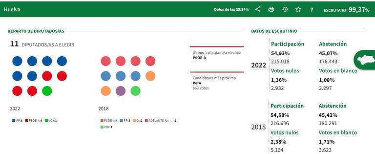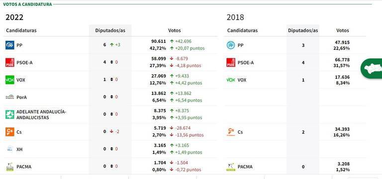 Hay un ganador indiscutible: El PP obtiene en Huelva 90.308 votos, casi 42.923 votos más y 6 parlamentarios. El PSOE se hace con 57.903 votos, unos 8.875 menos y 4 parlamentarios; VOX saca 26.995 votos, unos 89.359 más. Por Andalucía llega a los 13.830 y Adelante 8.358 y se causan heridas mutuas. Y lo de Ciudadanos es de traca: 28.686 votos menos y desaparece del mapa político de Huelva. Solo saca 5.707 sufragios.