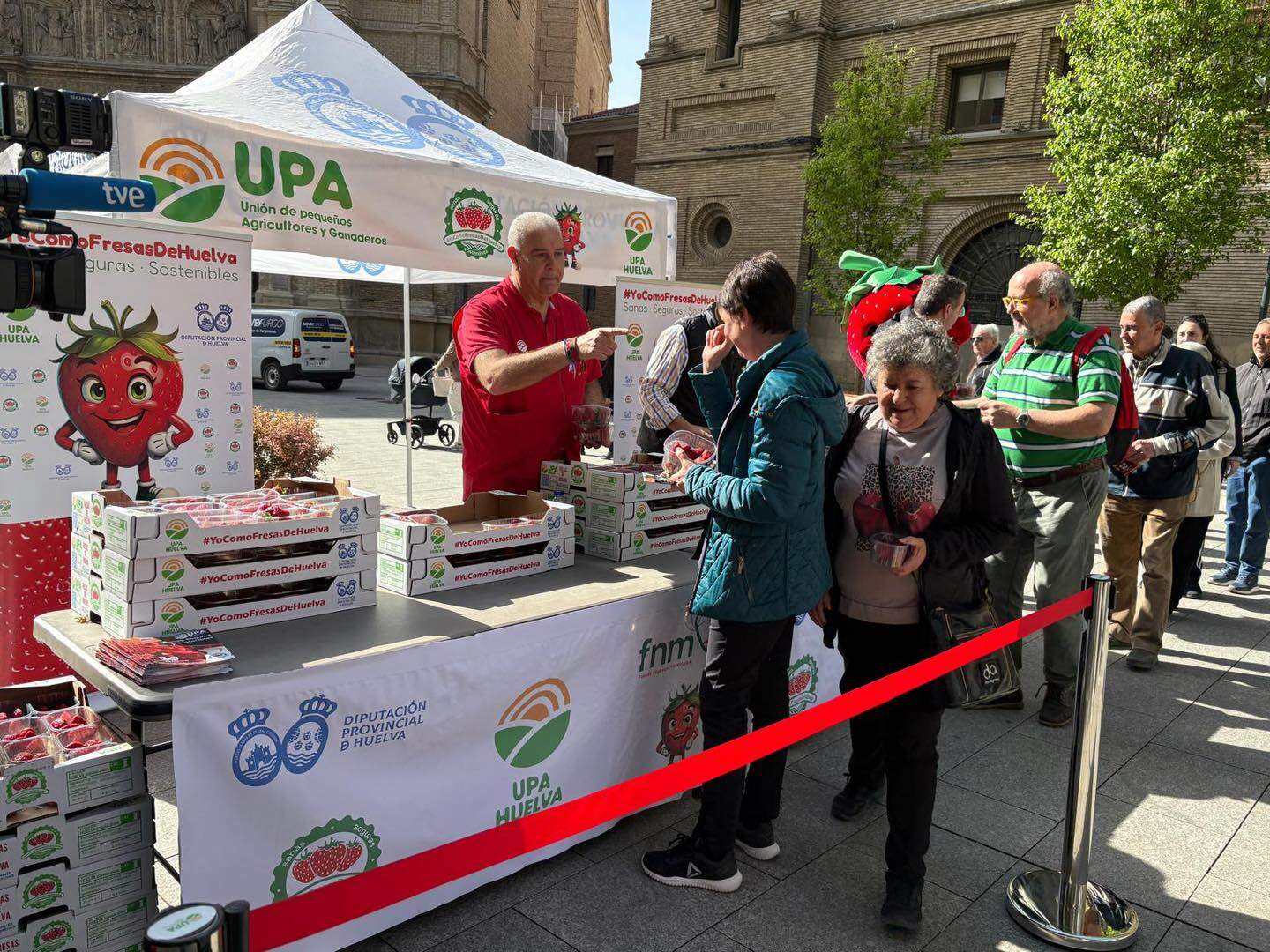 La organización agraria UPA Huelva ha llevado este miércoles el sabor de la provincia hasta Zaragoza con una acción promocional en la plaza de Santa Engracia, donde ha repartido un total de 1.000 tarrinas de fresas entre vecinos y visitantes.